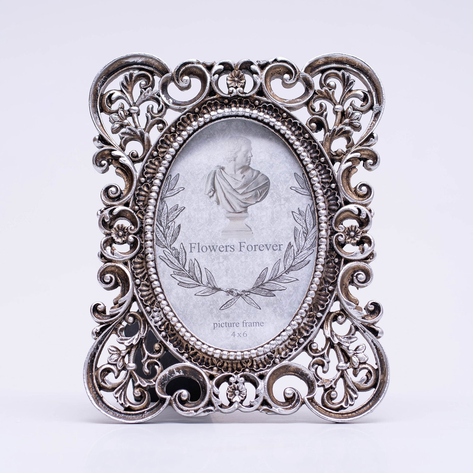 Elevate your interior decoration with the classic elegance of this Burnish Silver Vintage Baroque 4×6 Inches Photo Frame, designed to showcase your most cherished moments in timeless style. Expertly crafted from high-quality resin, the frame features intricate decorative scrollwork inspired by traditional Baroque artistry, finished in a rich burnished silver tone that adds depth and sophistication to any setting.