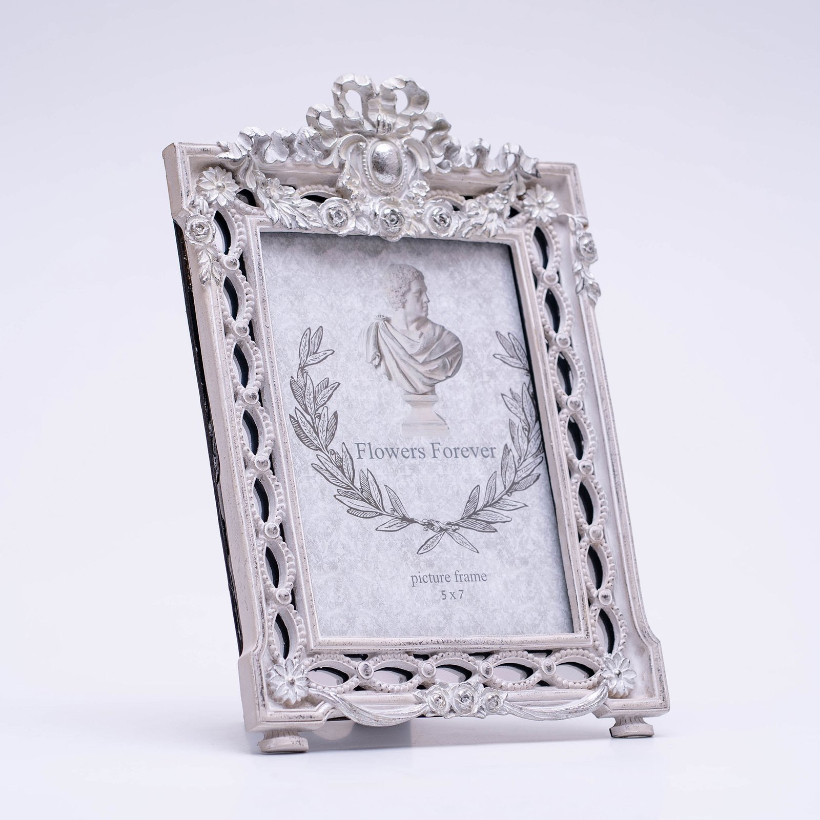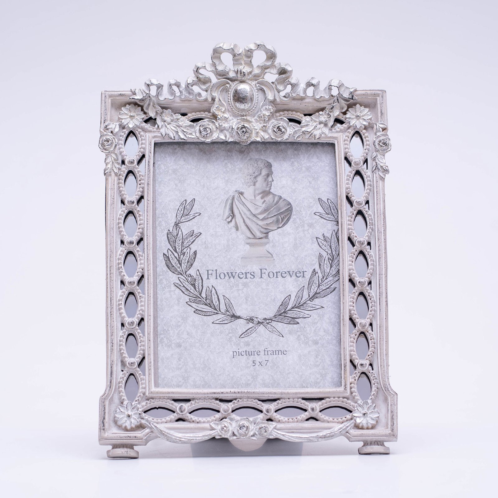 Add timeless charm to your decoration with this Vintage Baroque 5×7 Inches Tabletop Photo Frame, designed to beautifully highlight your most cherished memories. Featuring an antique floral Baroque pattern, the frame is crafted from high-quality resin and finished in an elegant silver & grey tone that brings classic sophistication to any interior setting.